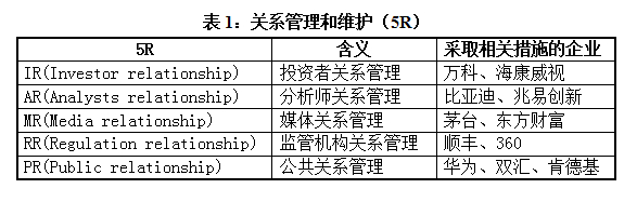 一是应依法依规履行信息披露义务,优化披露内容,为投资者价值判断和投资决策提供更多信息;同时确保保密管理纳入体系,严防泄密。二是做好5R关系的维护管理(见表1),力求减少信息不对称,通过价值传播促进市场对公司内在价值的了解与认同。