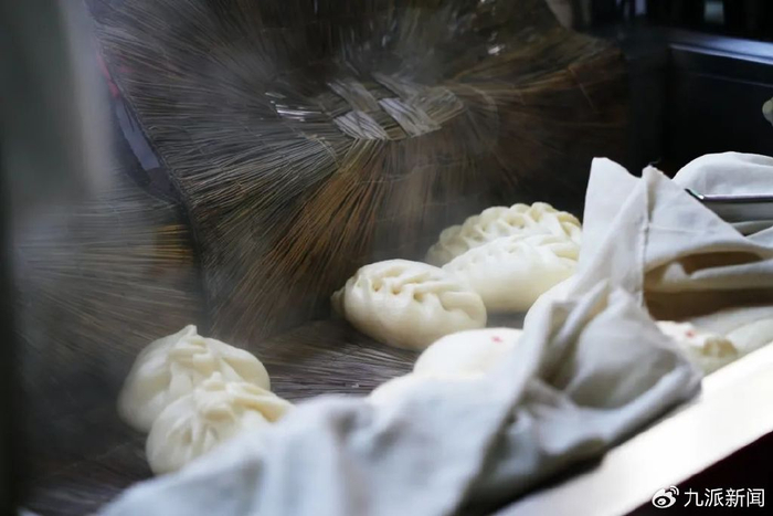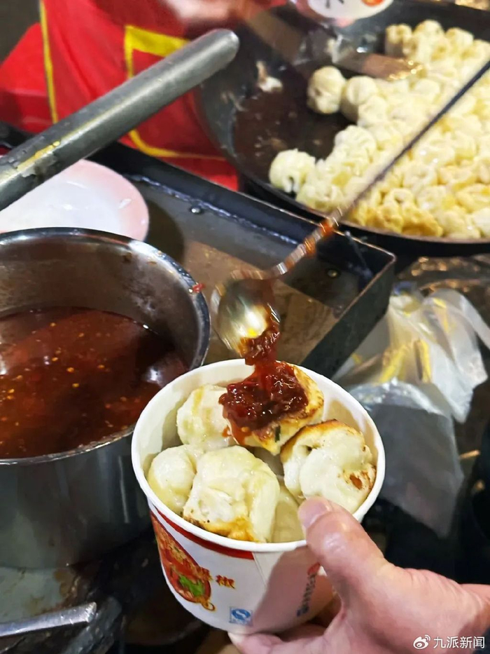 一口大铁锅一次性大约能煎80只小包子,用来装的纸碗最适合的分量是2两(8只)。刚出锅的煎包散发着诱人的焦香,老面蘸着老式甜辣酱,一口一个瞬间扫光。