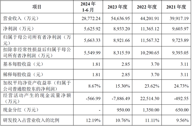 从财务数据来看,2021年-2024年上半年,矽电股份的营业收入分别为39,917.19 万元、44,201.91 万元、54,636.95 万元和28,772.24 万元,扣除非经常性损益后归属于母公司所有者净利润9,393.05 万元、10,290.65 万元、8,315.59 万元和5,549.99 万元。公司业务规模不断扩大,主营业务发展情况良好。