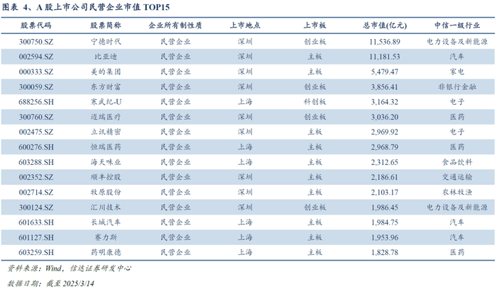 在这场民营经济发展的时代浪潮中,深交所依托改革开放前沿特区的区位优势,汇聚了一大批各行业的领军民营企业,形成了颇具竞争力的民营上市企业集群。截至2025/3/14,深市聚集超过1900余家民营上市公司,占深市上市公司总数的近七成;民营上市公司总市值合计约22.04万亿元,占深市上市公司总市值的六成以上。并且,A股市值前4的民营企业全部上市于深市,市值前15的民营企业中9家上市于深交所。作为表征深市核心资产的深证100指数,汇聚了这些具有全球竞争力的民营龙头企业,承载的民营经济创新动能,配置价值日益凸显。