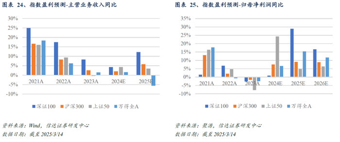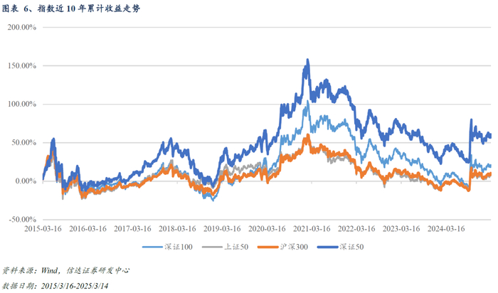 深证100指数处于估值相对低位,具备配置价值。截至2025/3/14,深证100指数市盈率TTM(剔除负值)为20.3倍,处于近十年的35.79%分位水平;指数市净率为2.55倍,处于近十年的21.02%分位水平,均处于历史中枢下方区间,具有良好的安全边际和配置价值。