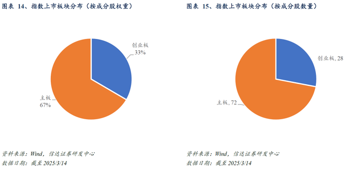 深证100指数的战略新兴产业属性凸显。相对于聚焦沪市核心资产的上证50指数和表征沪深两市核心资产的沪深300指数,深证100展现出显著的结构性差异,明显更聚集于新经济。截至2025/3/14,深证100的金融板块(银行+非银行金融)合计权重仅为9.17%,食品饮料行业权重6.57%,与上证50以白酒(13.37%)、全国性股份制银行(10.55%)、国有大型银行(9.59%)为主的传统经济结构形成鲜明对比,新兴产业属性凸显。