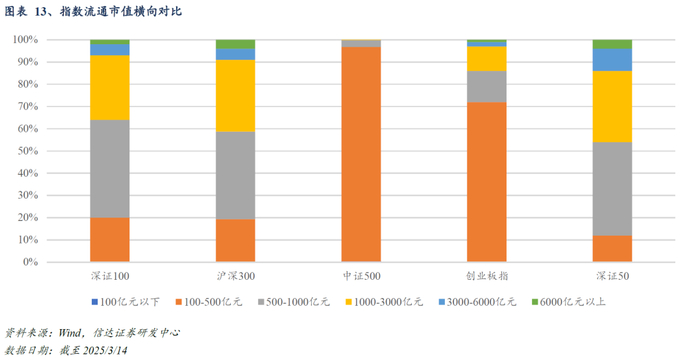 深证100充分彰显深市核心资产的蓝筹特质与市场代表性。截至2025/3/14,深证100指数成分股总市值接近13.31万亿元,总市值中位数871.19亿元,加权总市值3387.60亿元;自由流通市值中位数380.21亿元,加权自由流通市值1779.09亿元,与表征沪深两市核心资产的沪深300指数的流通市值中枢较为相近。其中,总市值以及自由流通市值最大的成分股均为宁德时代,该公司总市值与自由流通市值分别为11536.89亿元和6490.07亿元,总市值最小的成分股为TCL中环,自由流通市值最小的成分股为招商港口。