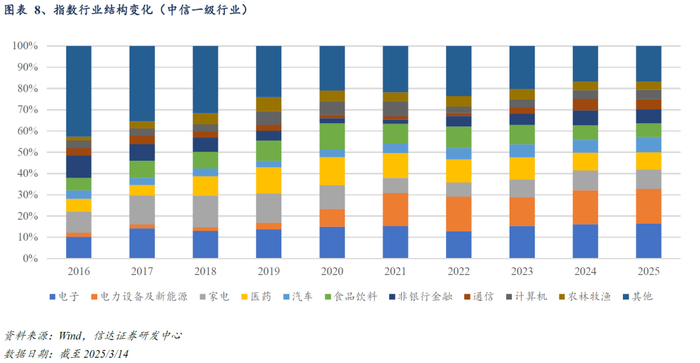 指数行业结构演变与中国经济转型升级进程形成共振:2015年至今,指数权重行业从传统产业主导转向科技创新驱动。截至2025/3/14,电子(16.55%)、电力设备及新能源(16.20%)两大硬科技板块占据核心地位,与家电(9.08%)、医药(8.14%)、汽车(7.20%)共同构成前五大权重行业。相对于沪市蓝筹指数,深证100指数的新兴产业属性凸显。