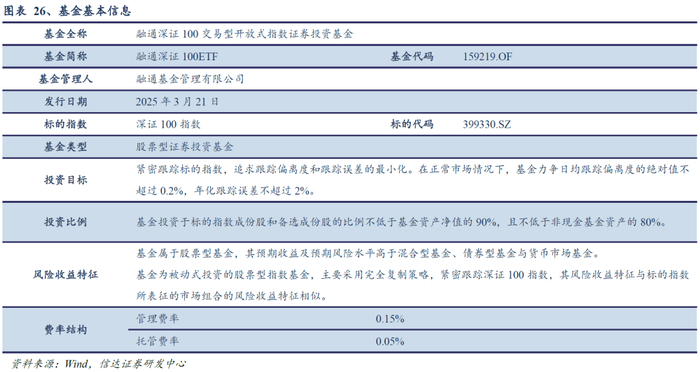 融通深证100ETF(基金代码:159219;场内简称:深证100ETF融通)发行于2025年3月21日,管理人为融通基金管理有限公司。融通深证100ETF跟踪深证100指数,以紧密跟踪标的指数,追求跟踪偏离度和跟踪误差的最小化;在正常市场情况下,基金力争日均跟踪偏离度的绝对值不超过0.2%,年化跟踪误差不超过2%。基金管理费率为0.15%,托管费率为0.05%。