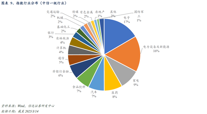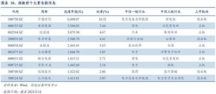 指数前十大权重股合计占比40.51%,汇集多个产业赛道头部企业。截至2025/3/14,指数前十大成分股包括宁德时代、美的集团、比亚迪、东方财富、五粮液、立讯精密、格力电器、京东方A、迈瑞医疗、汇川科技,汇聚了动力电池、新能源车、智能家电、金融科技服务、消费电子、显示面板等多个赛道的龙头企业。