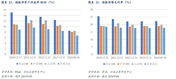 深证100指数盈利能力和成长性具备优势。截至2024/9/30,深证100指数在盈利能力方面表现突出,指数ROE和销售毛利率均优于沪深300、上证50和万得全A指数,体现出成分股整体较高的盈利水平。从成长性来看,根据盈利预测数据,指数的营收同比增速相较于沪深300、上证50和万得全A指数也有一定优势,进一步凸显了其作为创新蓝筹指数的优质性和增长潜力。