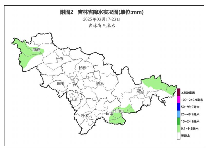 上周,我省降水明显偏少。全省基本无降水,仅白城、辽源、长白山保护开发区和延边有0.1毫米降水,其他地区无降水。