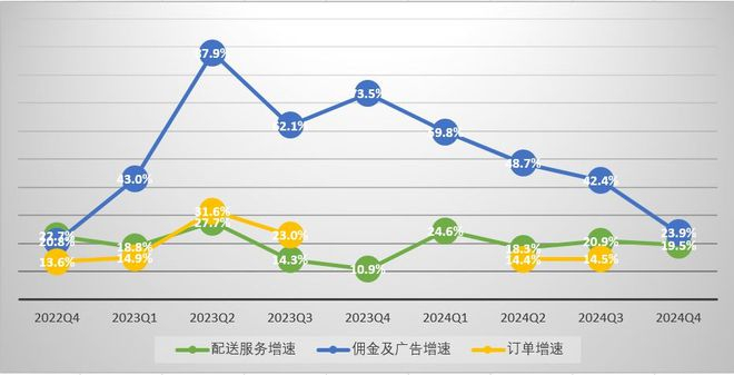 根据刚刚公布的2024年四季度业绩显示,美团的平台佣金服务收入增速达到了23.9%,而同期的配送服务增速为19.5%。