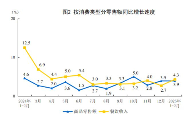 作为国内餐饮行业最大规模的线上平台,在美团2024年实现收入大幅增长的同时,国内餐饮行业的增长仍然在下滑。根据国家统计局公布的2024年国内餐饮行业数据显示,全行业增长只有5.3%,较前一年的20.4%大幅下滑;今年前两个月,餐饮行业的收入的同比增速再度下降到4.3%,远低于去年同期的12.5%。