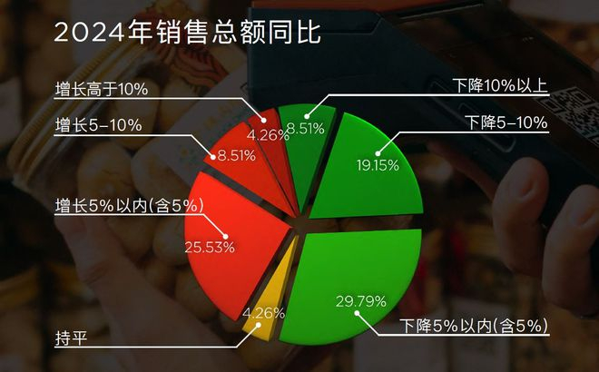 几乎就在美团闪电仓爆发式增长的同时,线下商超的经营开始出现恶化。根据中国连锁经营协会对47家超市企业的1万多家门店在2024年的经营情况摸底调查,只有38.2%的超市企业零售总额同比实现增长,其中大多数门店并无增加,相对应有57.4%的超市企业销售出现下降。"从统计结果看,2024年连锁超市行业面临较大的发展压力。除来客数外,其他关键指标实现同比增长的企业占比不到半数,向好的趋势不明显。"据壹览商业不完全统计,2024年国内至少有1.2万家门店宣布关闭。
