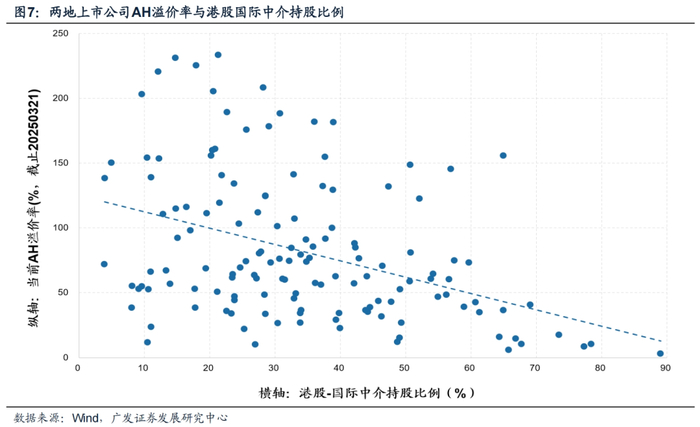 6. 机构持股比例能够一定程度上验证这一问题(图7)。由于数据上的限制,我们无法准确得知各类型机构持股占比,此处以国际中介持股比例近似代替(但实际上也包含个人投资者)。数据结果显示,国际中介持股较高的公司,AH溢价相对更低。