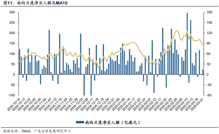 南向资金净买入本周出现降温。本周(3月17日—3月21日)南向资金净流入230亿港元,较上周净买入额减少386亿港元。个股层面,南向资金净买入额排名靠前的个股包括中国移动(净买入36.84亿港元),阿里巴巴-W(净买入28.79亿港元),盈富基金(净买入7.24亿港元),理想汽车-W(净买入7.19亿港元);净卖出额排名靠前的个股包括腾讯控股(净卖出31.28亿港元),中芯国际(净卖出25.87亿港元),美团-W(净卖出8.88亿港元)。