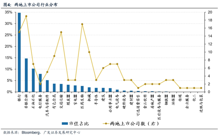4. 本轮上行行情港股表现明显优于A股,主因在于行情的驱动更倾向于港股科技核心资产,不过这部分资产基本都未在两地同时上市。AH两地上市标的仍以金融和稳定类资产为主,其中银行、非银金融、石油石化、电信服务四个行业合计市值占比达67.7%。