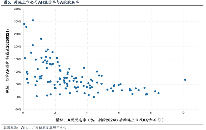5. 股息率水平对于溢价结构起到至关重要的作用。股息率水平越高的公司,两地价差越收敛。这里隐含的逻辑或在于,持续稳定的高股息更具买入和持有价值,从而部分抵消了流动性折价。