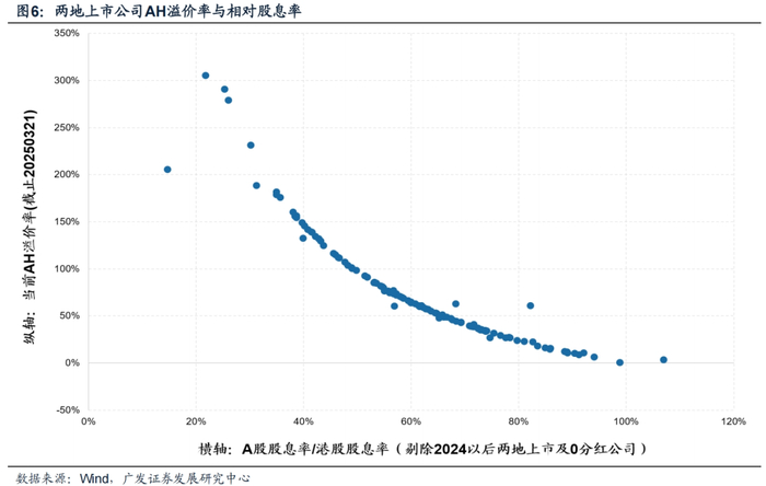 5. 股息率水平对于溢价结构起到至关重要的作用。图5展示A股股息率水平与AH溢价率的关系,图6展示AH股息率比值与AH溢价率的关系。结果显示,股息率水平越高的公司,两地价差越收敛。这里隐含的逻辑或在于(尤其对于机构投资者而言),持续稳定的高股息更具买入和持有价值,从而部分抵消了流动性折价。
