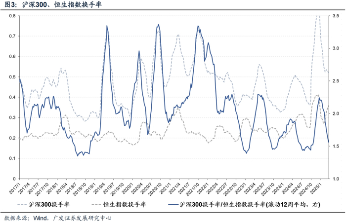 3. 2021年之后港股市场相对A股波动放大,猜测之一,可能与相对流动性折价扭转有关(图3)。2021年之后核心资产泡沫破裂,A股成交萎缩幅度更大,沪深300换手率/恒生指数换手率比值有所降低。