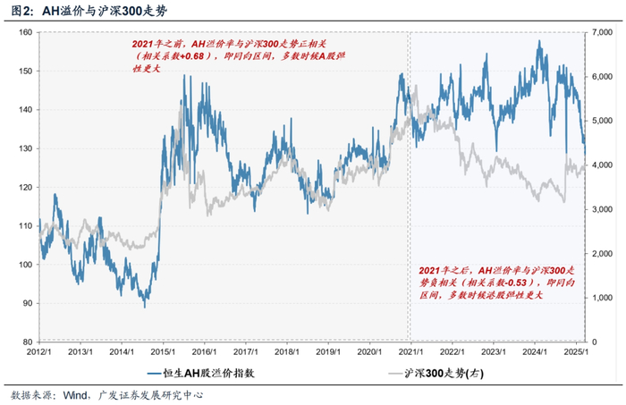 2. A股和港股的相对弹性在大约2021年前后发生了一定变化。2012-2020年,AH溢价率与沪深300走势正相关;2021年至今,AH溢价率与沪深300走势负相关,即AH溢价收敛区间主要发生在上行阶段。