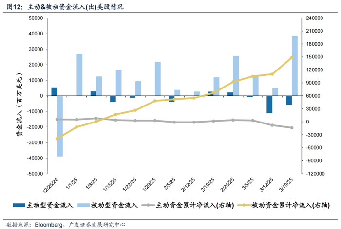 美股主动资金流出明显放缓,被动资金流入大幅扩大。截至本周三(3月13日—3月19日),美股主动资金流出58.6亿美元,相比上周流出111.1亿美元明显收窄,被动资金流入384.1亿美元,相比上周流入49.8亿美元出现大幅度增加。