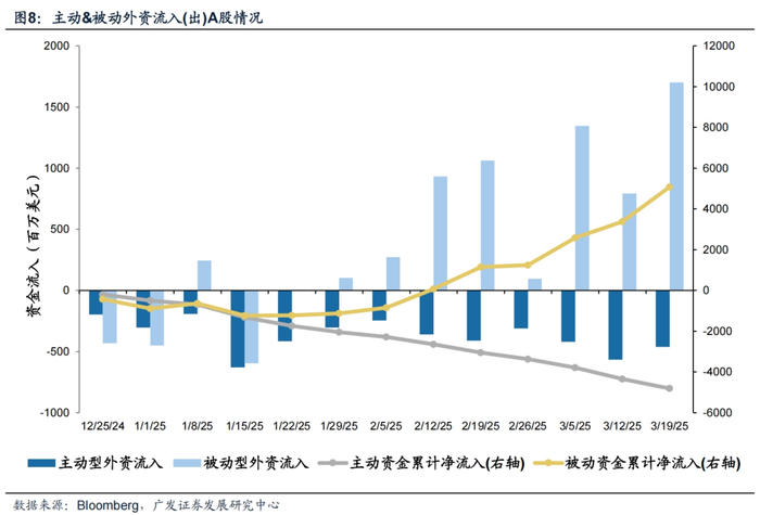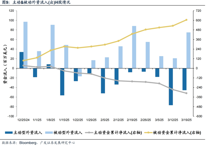 A股主动外资流出放缓,被动外资加速流入;H股主动外资流出放缓,被动外资流入大幅增加。截至本周三(3月13日—3月19日),A股主动外资流出4.6亿美元(相比上周流出5.7亿美元有所收窄),被动外资流入17.0亿美元(相比上周流入7.9亿美元明显扩大);H股主动外资流出0.45亿美元(相比上周流出0. 77亿美元有所收窄),被动外资流入0.75亿美元(相比上周流入0. 21亿美元大幅增加)。