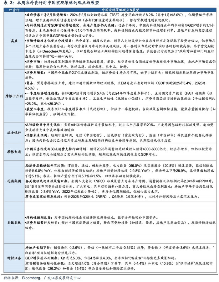 高盛、摩根士丹利、野村证券一致预期2025年中国经济增长可能承受一定压力,但由于政策刺激与技术投资支撑,一季度增速稳健;摩根大通、瑞银认为中国政府债券对信贷扩张贡献显著,社融存量增速回升但增量低于预期;花旗集团、美银美林称房地产投资缩减仍是经济增长压力核心。