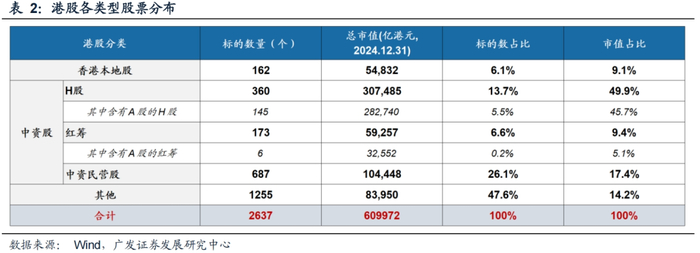 1. 当前两地上市公司合计仅151家,其中包括145家H股、6家红筹企业(表2)。截止2024年末数据,两地上市标的数量占全部港股比重仅5.7%,但市值占比高达50.8%,因此这部分公司对港股股指权重有较大影响。