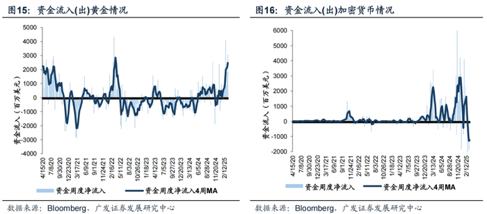 本周黄金获资金流入,同时资金小幅流入加密货币资产。截至本周三(3月13日—3月19日),黄金的周度资金净流入为30.7亿美元,相比上周流入21.8亿美元有所增加;从滚动四周维度来看,近期黄金资金流入出现明显的斜率抬升。加密货币资产的周度资金净流入为1.7亿美元,相比上周流出18.8亿美元出现暂时性扭转态势,但从滚动四周维度看,目前资金对加密货币整体处于净流出区间,暂未出现趋势性拐点。