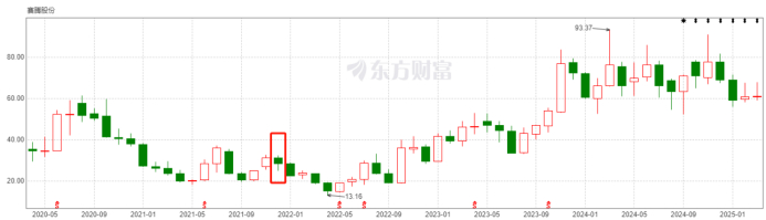 如上图所示,在2023年6月市场受到减持公告冲击后,股价从70.61元/股的高点迅速回落至20元/股至40元/股的区间,目前仍处于估值修复中。