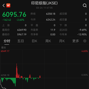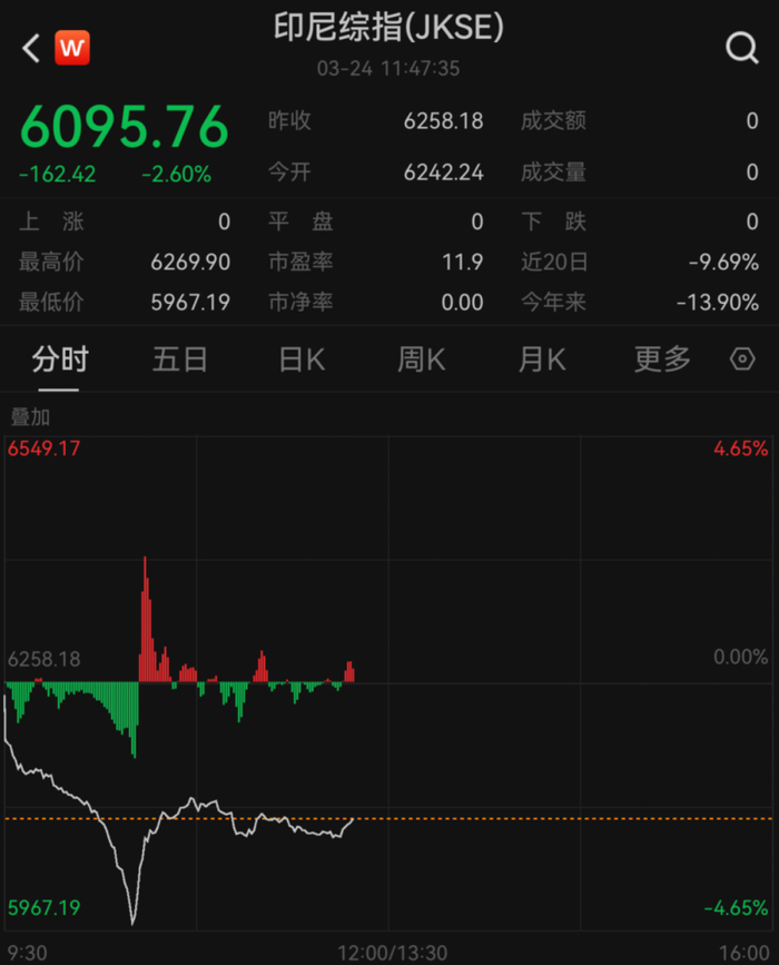 3月24日,印尼股市再度全线重挫,印尼基准股指雅加达综合指数(JKSE)自2021年以来首次跌破6000点,日内一度暴跌4.65%,截至北京时间13:00,跌幅为2.6%,年内累计跌幅扩大至13.34%。