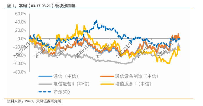 本周(03.17-03.21)通信板块下跌3.03%,跑输沪深300指数0.74个百分点,跑赢创业板指数0.31个百分点。其中通信设备制造下跌2.78%,增值服务下跌3.72%,电信运营下跌3.59%,同期沪深300下跌2.29%,创业板指数下跌3.34%。
