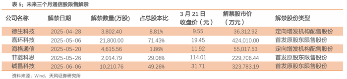 未来三个月限售解禁通信股共5家,解禁股份数量占总股本比例超过15%的公司有嘉环科技、菲菱科思和铖昌科技。