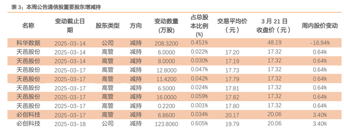 本周通信板块涨幅靠前的个股有*ST信通(通信设备)、东土科技(机器人)、ST高鸿(智能网联);跌幅靠前的个股有科华数据、大富科技、光环新网。