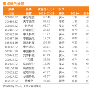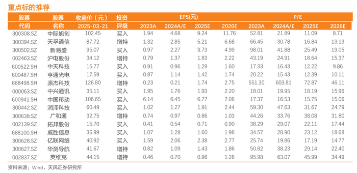 1、光模块&光器件,重点推荐:中际旭创、新易盛、天孚通信、源杰科技(电子联合覆盖);建议关注:光迅科技、索尔思、鼎通科技、光库科技、博创科技、仕佳光子、中瓷电子(新材料联合覆盖)、铭普光磁、剑桥科技、太辰光、德科立等;