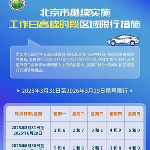 据首都之窗网站,为切实巩固大气污染治理成效,降低机动车污染物排放,持续改善首都空气质量,市政府决定自2025年3月31日至2026年3月29日,继续实施工作日(因法定节假日放假调休而调整为上班的星期六、星期日除外)高峰时段区域限行交通管理措施。