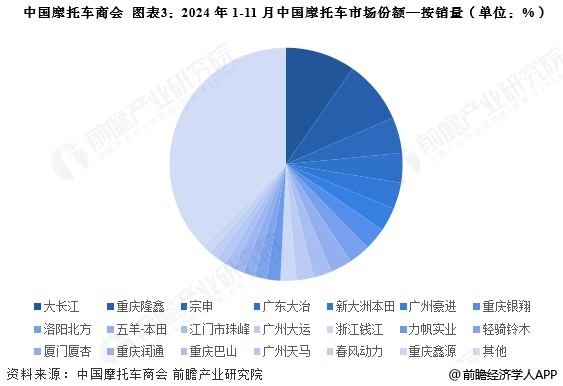 目前,中国摩托车行业竞争较为激烈,品牌数量较多。根据中国摩托车商会统计数据显示,2024年1-11月,全行业完成摩托车销量1816.45万辆,同比增长1.25%。市场份额占比较大的品牌有大长江、隆鑫、宗申、广东大冶、新大洲本田等。