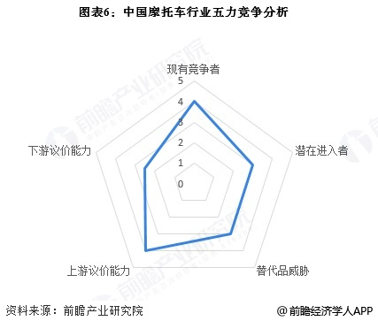 从五力竞争模型角度分析,随着新能源技术的发展,公共交通的普及,摩托车面临的替代品威胁较大;行业现有竞争者数量较多,且市场份额,尤其是燃油摩托车市场份额较为分散;上游供应商则为一般原材料制造商、精密零件制造商和轮胎制造商等企业,这些行业均已较为成熟,且应用的下游领域较广,因此对摩托车行业议价能力较强,而下游消费市场主要以三四线城市通行需求和发达地区的高端消费需求为主,且前者占比较大,因此下游议价能力一般;目前行业存在较高的准入资质以及资金、技术门槛较高,潜在进入者威胁较小,但由于电动摩托车的发展以及三四线城市存在的刚性消费需求,因此行业仍具有较大的发展潜力,吸引着大量潜在进入者进入。