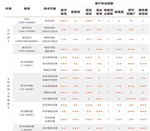 液冷系统化、全液冷模式以及制冷剂创新成重点关注。未来智算中心制冷系统架构有望遵循从芯片(服务器)侧—机柜侧—末端空调侧—冷源侧的整条冷链系统化解决方案。用户关注技术可靠性、运行能效、初投资、出柜率、占地空间、噪声程度、柔性调节以及对建筑条件要求等方面,不同制冷技术仍将在适合应用场景保持发展。液冷方式上可能采用全液冷的方式,包括全冷板,全浸没,或者冷板+浸没的方式。液冷新型制冷剂成本居高不下,液冷新型制冷剂的革新将是液冷技术革新的主要方向之一,比如用普通水作为液冷制冷剂的解决方案。