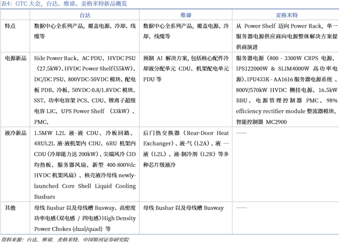 本次GTC大会上,台达、维谛、麦格米特等厂商纷纷就AI电源以及液冷产品提出系列解决方案。台达、维谛产品线全面,产品涵盖供配电设备、冷却、数字化管理、生命周期服务,贯穿设计、制造、安装和测试环节。麦格米特从 Power Shelf 向 Power Rack拓展,突破AI 服务器电源边界,向电源整体解决方案提供商演进
