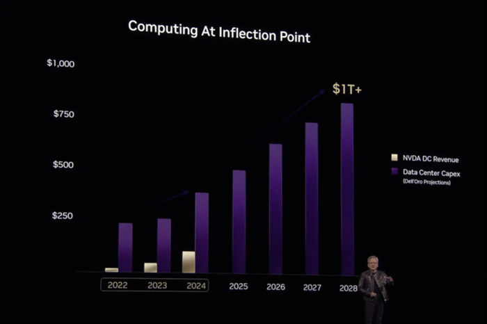 事件:美国当地时间3月17至21日,英伟达GTC大会将在加州圣何塞举行,英伟达创始人兼CEO黄仁勋发表演讲,英伟达展示其正在全栈布局构建 AI 时代的基础设施,并提出28年全球数据中心Capex超万亿美元。