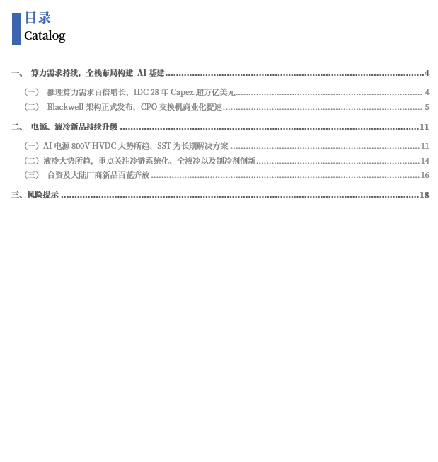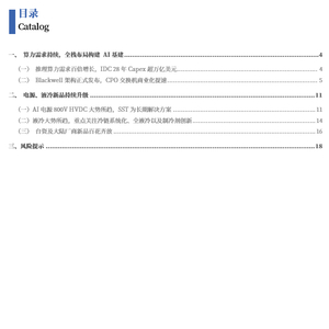 英伟达在CTC大会上展示其正在全栈布局 AI 时代的基础通过芯片架构(Blackwell→Rubin→Feynman)、硅光子学CPO的交换机、液冷散热成为标配等硬件迭代革新,打造互联互通的 AI 超级集群,并加速软件开源丰富生态(Dynamo、Omniverse)、行业渗透(机器人、自动驾驶、量子计算),构建生态护城河。我们认为,在当前推理AI以及物理AI需求加速释放,数据中心电源、高速铜连接、CPO、液冷散热作为算力基建新趋势仍值得长期关注。