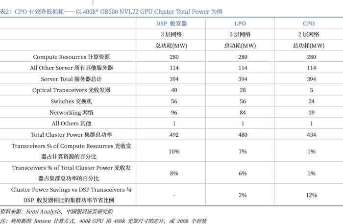 CPO的主要优势是显著降低了功耗,这是因为(1)在交换机本身,由于不再需要数字信号处理器(DSP)以及可以使用低功率激光光源,因此节省了大量电力。(2)CPO允许更大的交换机基数,允许集群通过使用CPO拥有两层网络,而不是使用DSP收发器的三层网络,即意味着消除了整个层和一组交换机,使得成本和功耗节省。根据Semi Analysis分析,对于一个400k* GB200 NVL72部署,从基于DSP收发器的3层网络转向基于CPO的2层网络,可以节省高达12%的集群总功耗——将收发器功耗从计算资源的10%降低到仅1%。