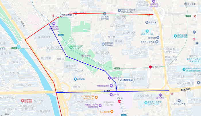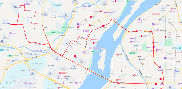 2.调整后线路走向:长堎公交枢纽—长富大道—长堎大道—明矾路—山丹路—幸福北路—霁亭路—长麦路—新建大道—礼步湖大道—南斯友好路—南昌大桥—洪城路—井冈山大道—八一大道—阳明路—八一大桥—红谷中大道—世贸路—金融大街—怡园路—凤凰中大道—礼步湖大道—长征西路—兴国路—长富大道—长堎公交枢纽;