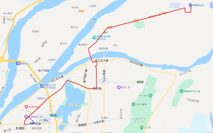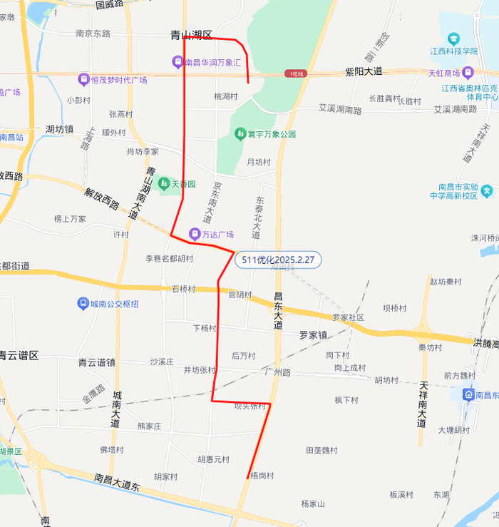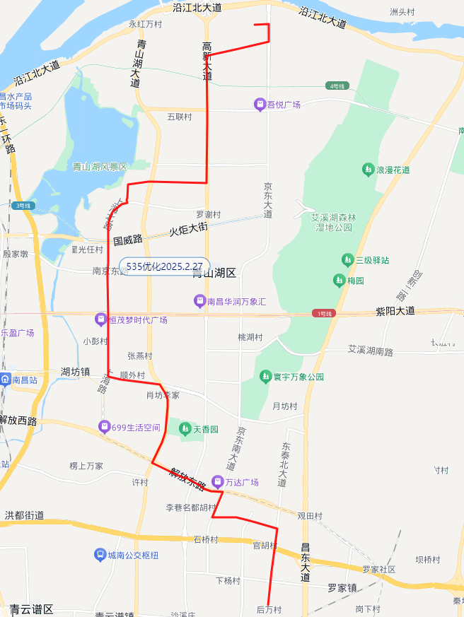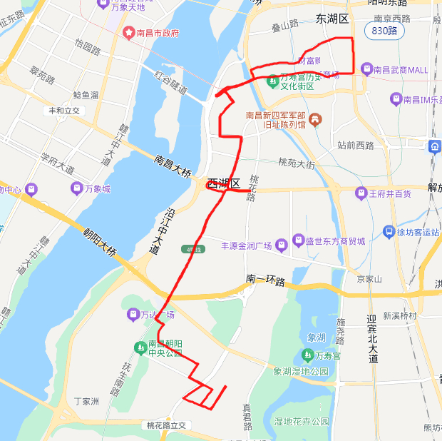 1.原线路走向:明矾路—兴国路—新建大道—礼步湖大道—南斯友好路—南昌大桥—洪城路—解放路—上海路—北京东路—高新南大道;