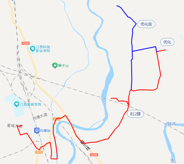 2.调整后线路走向:子羽路—云海路—桃花南路—云飞路—红梅路—雷池街—翠菊路—云锦路—抚生南路—抚生路—洪城路—抚生路—朝阳洲中路—团结路—西河滩路—中山西路—抚河北路—民德路—八一大道—中山路—中山西路—西河滩路—团结路—朝阳洲中路—抚生路—洪城路—抚生路—抚生南路—云锦路—翠菊路—雷池街—红梅路—云飞路—园常寺路—云海路—子羽路;