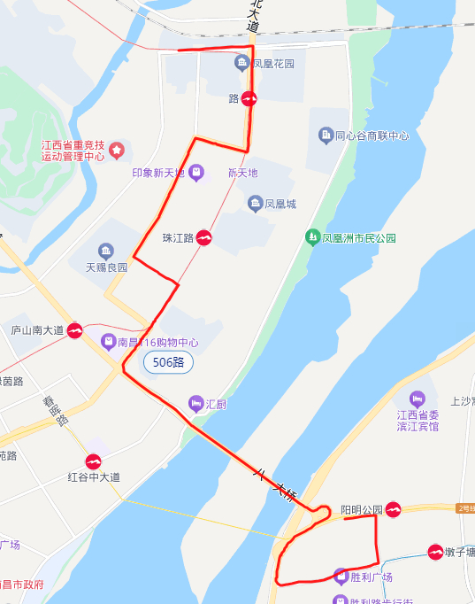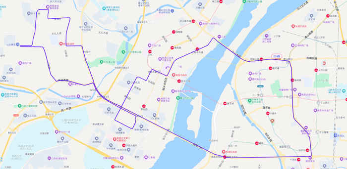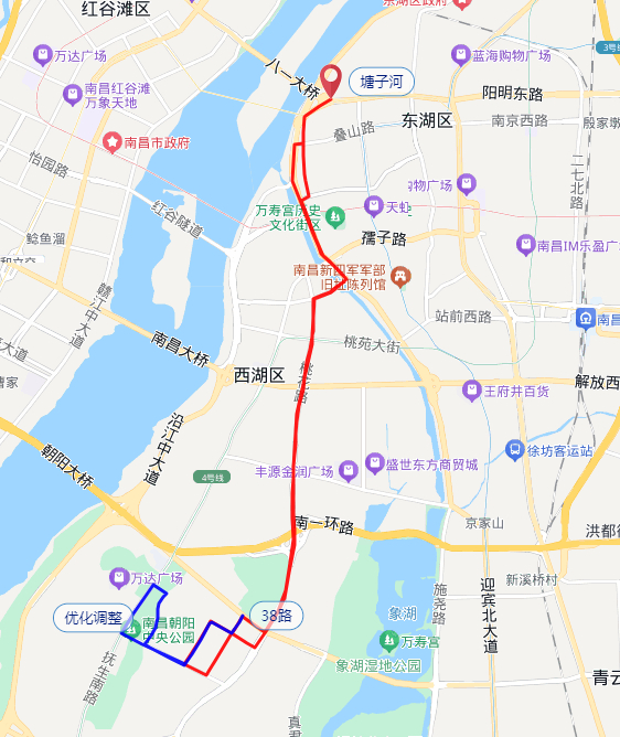 2.调整后线路走向:八一桥—阳明路—象山北路—叠山路—沿江中大道—八一大桥—庐山南大道—丰和北大道—濠江路—凤凰北大道—锦江路—丰和北大道—黄河路—黄河路西口;