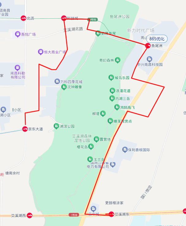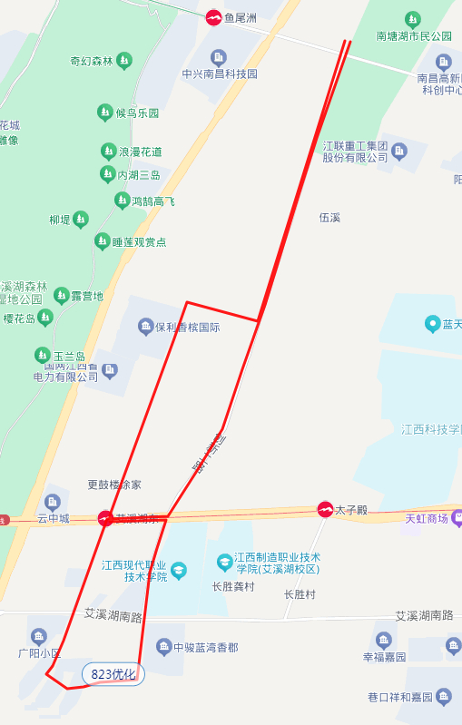2.调整后线路走向:公交高新停车场—京东大道—金庐北路—高新七路—艾湖路—火炬五路—俊彦路—艾溪湖北路—明山庙路—艾溪湖四路—创新一路—艾溪湖三路—昌东大道—紫阳大道—艾溪湖大桥东;
