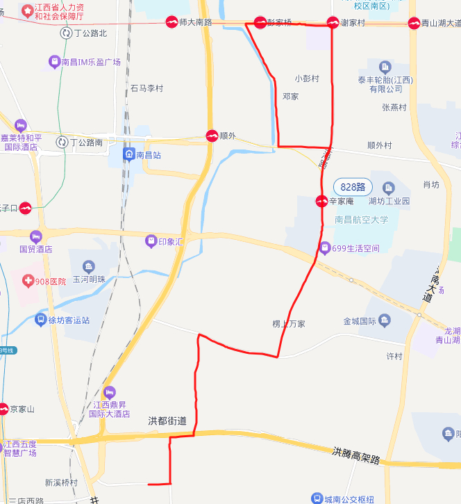 1.原线路走向:南昌西站—石钟山路—西站大街—黄岗山路—九江街—九龙大道—会昌路—永安一路—卧龙路—红谷南大道—红谷中大道—世贸路—赣江中大道—会展路—红谷中大道—春晖路—丰和北大道—黄河路;