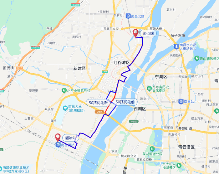 因红谷南大道部分道路交通拥堵情况较为严重,影响运行效率,优化调整50路