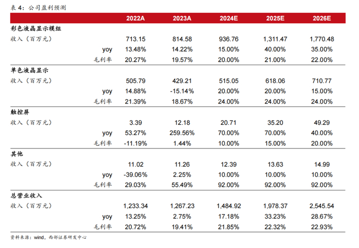 触控屏:现阶段公司触摸屏产品主要用于配套客户定制的彩色液晶显示屏及模组产品。2021年公司触摸屏生产线建成并投产,通过不断优化设备工艺和作业模式生产水平得到了快速提升。目前触摸屏尺寸范围从原来的≤15.6寸提升至≤32寸,同时增加黄光 sensor工艺能力,为公司开拓高端应用产品、提升产品价值打下坚实基础。2023年公司触摸屏产品实现营业收入1218.15万元,同比增长259.56%,未来有望成为公司新的业绩增长点。毛利率方面,公司目前该业务规模仍较小(年营收在千万级),随着产品持续成熟与快速放量,规模效应有望带动公司显示与触控屏产品毛利率的增长。因此,我们假设24-26年该业务营收增速为70%、70%、40%,毛利率分别为10%、15%、20%。