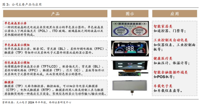 公司主要产品包括单色液晶显示屏/显示模组、彩色液晶显示模组和触摸屏,可以为客户提供定制化解决方案。公司与深天马形成长期战略合作关系,彩屏主要与京东方、华星光电等企业合作,截至24年7月显示应用产品超5000种,客户涵盖了细分行业龙头如LG、格力、三星、松下、霍尼韦尔等。
